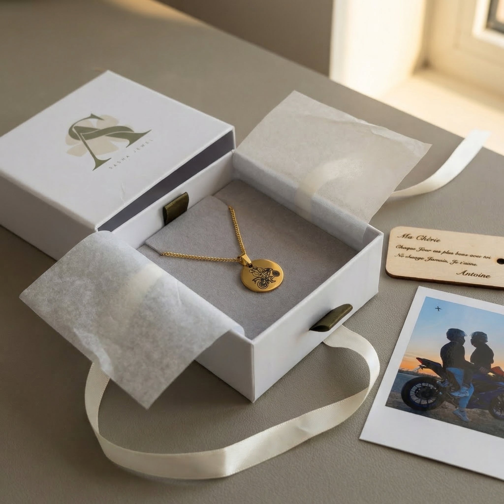 Sasha Jewel est née d'une idée simple : transformer ce moment en bijou. Ta photo, redessinée en line art, gravée sur un pendentif unique.